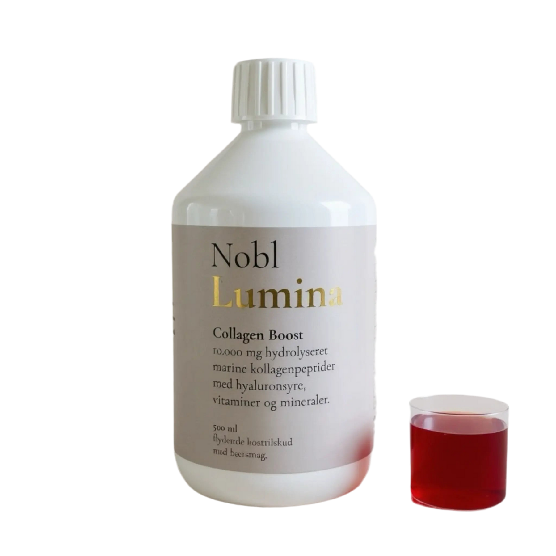 Multifiltreret vand, hydrolyseret marine kollagen (fisk) type I & III 10.000 mg, vitamin C (L-ascorbinsyre), naturlig aroma (jordbær), naturlig farve (lilla kartoffelpulver), emulgator: xanthangummi, hyaluronsyre (vegansk natriumhyaluronat), siliciumdioxid, vitamin B5 (pantothensyre), biotin (vitamin B7), vitamin B6 (pyridoxinhydrochlorid), selen (natriumselenit), sødestoffer: steviolglycosider (Stevia rebaudiana Bertoni), sucralose, surhedsregulerende middel: citronsyre, vitamin D3 (cholecalciferol), vitamin B12 (methylcobalamin), konserveringsmidler: kaliumsorbat og natriumbenzoat.
